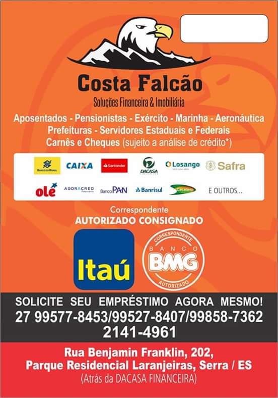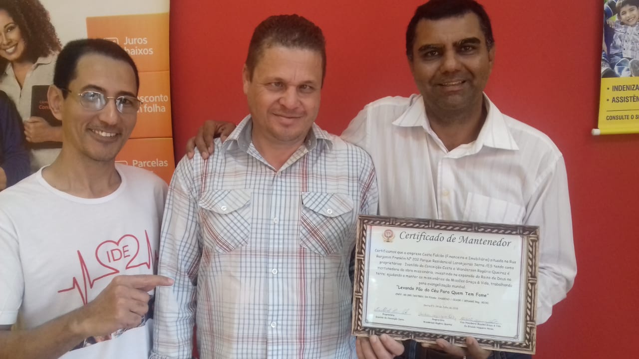 Quero louvar a Deus pela empresa Costa Falcão (Financeira e Imobiliária), situada no bairro Parque Residencial Laranjeiras, Serra /ES , que nesta quarta-feira ( 24/07/2019) oficializou uma parceria com as Missões Graça & Vida se tornando mantenedora da obra missionária, investindo na expansão do Reino de Deus na Terra e trabalhando para a evangelização mundial.