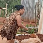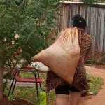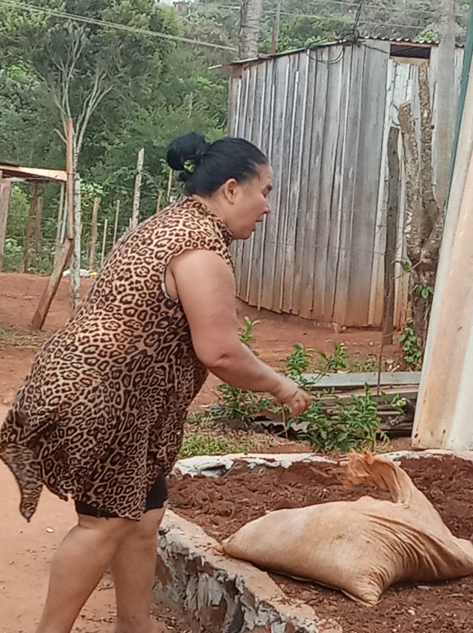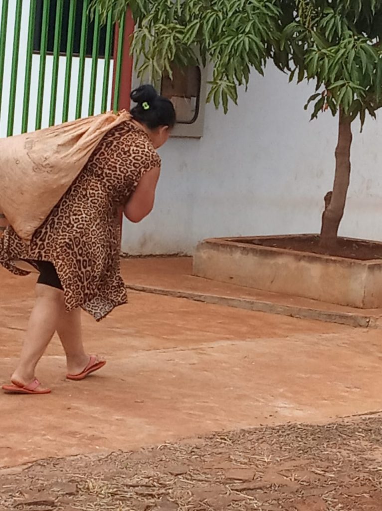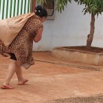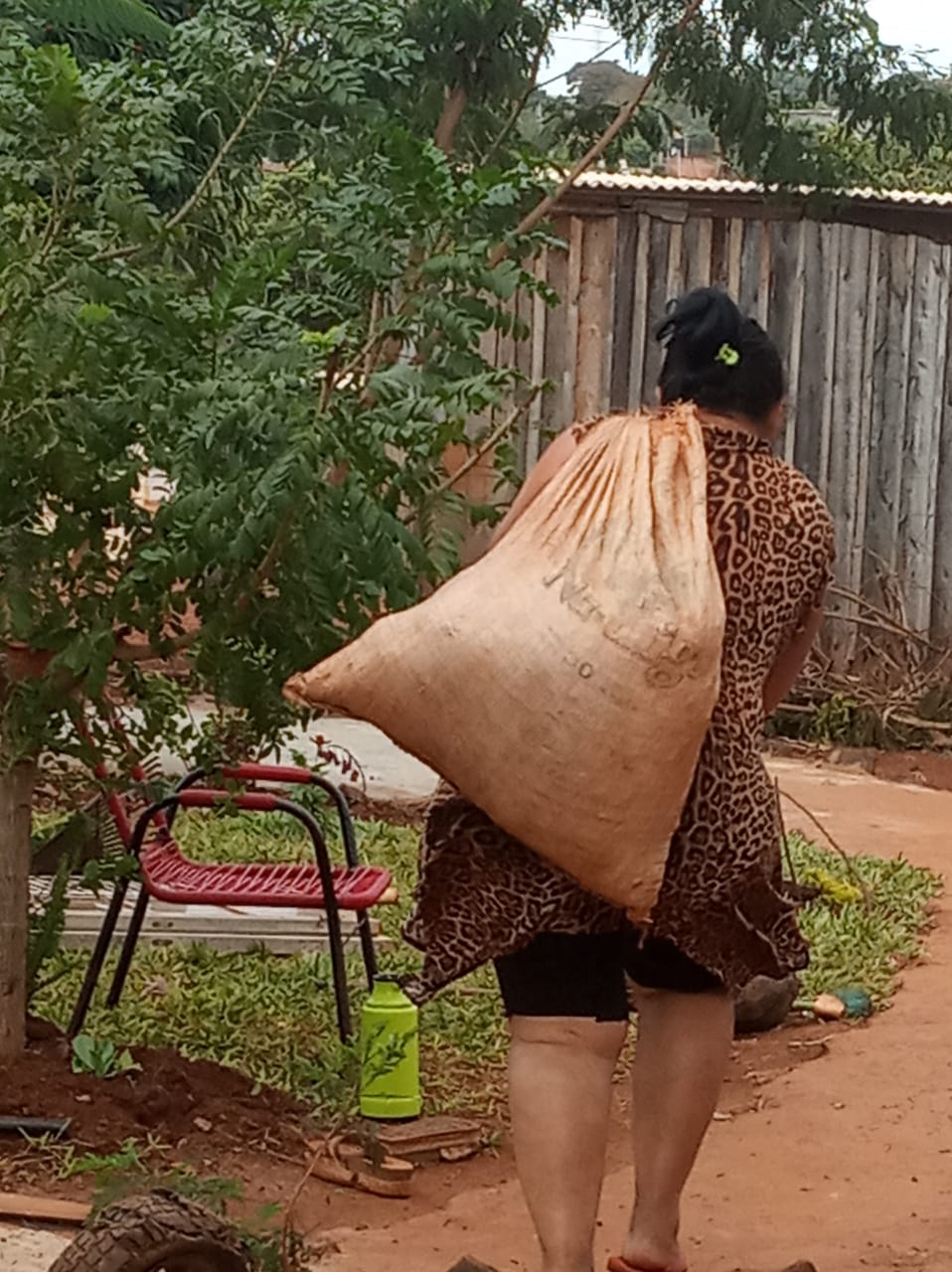 Aqui as mulheres trabalham sem condições nenhuma. Vejam essa irmã carregando um saco de barro nas costas e não reclama, é impressionante como elas têm garra. Essa irmã tem 57 anos de idade e vive sozinha. Ela está aterrando um pedaço do quintal pra ela construir uma varanda pra cultuar.